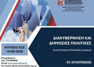 Το Τμήμα Πολιτικής Επιστήμης και Διεθνών Σχέσεων του Πανεπιστημίου Πελοποννήσου προσκαλεί για το ακαδημαϊκό έτος 2026-2027 υποψήφιους φοιτητές για το εξ αποστάσεως Πρόγραμμα Μεταπτυχιακών Σπουδών (Π.Μ.Σ.) με τίτλο «Διακυβέρνηση και Δημόσιες Πολιτικές».
